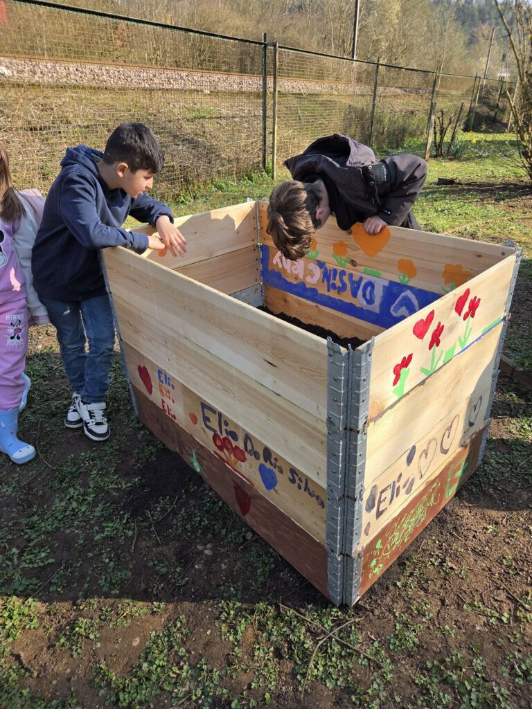 Nous avons nettoyé le parterre de fleurs pour y planter de nouvelles fleurs. Le maître d’école Joé Decker (C 2.2) a construit un parterre avec sa classe et y a planté des fleurs.