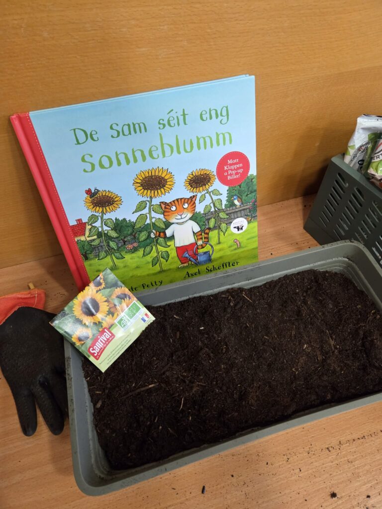 Mir hunn d’Buch “De Sam séit eng Sonneblumm” gelies an hu Sonneblummen an der Klass ugeplanzt déi mir zu engem méi spéide Moment an de Gaart setze kennen.